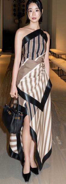 ¹æÈ¿¸°Àº ÅäÁî ¾Ú¹ö¼­´õ ¹ßŹ ÀÌÈÄ µÎ ¹øÂ°·Î ÆÐ¼Ç¼î¿¡ Âü¼®Çß´Ù. À̳¯ ±×´Â Å©¸®¿¡ÀÌÆ¼ºê µð·ºÅÍ ¸¶Å׿À ŽºÎ¸®´Ï°¡ µðÀÚÀÎÇÑ 2026 º½/¿©¸§ ¿©¼º Ä÷º¼Ç ·èÀ» Âø¿ëÇß´Ù. ÇÁ·©Å© ½ºÅÚ¶ó(Frank Stella)ÀÇ ±×·¡ÇÈ¿¡¼­ ¿µ°¨À» ¹ÞÀº ½ºÆ®¶óÀÌÇÁ ÆÐÅÏÀÇ ½ºÄ«ÇÁ Åé°ú ½ºÄ¿Æ®¿¡ ¾ÆÀÌÄÚ´Ð T ŸÀÓ¸®½º ž ÇÚµé ¹éÀ» ¸ÅÄ¡ÇØ ¼¼·ÃµÇ°í ¸ð´øÇÑ °¨°¢À» µå·¯³Â´Ù. À¯·ÁÇÑ ½ÇÅ© ÆÐºê¸¯ À§¿¡ ºí·¢ ³ªÆÄ ·¹´õ·Î °¡ÀåÀÚ¸®¸¦ Á¤±³ÇÏ°Ô ¸¶°¨ÇØ ¿ì¾ÆÇϸ鼭µµ ±¸Á¶ÀûÀÎ ½Ç·ç¿§À» °­Á¶ÇßÀ¸¸ç, ºê·£µå ƯÀ¯ÀÇ ÀåÀÎÁ¤½Å°ú ¾î¿ì·¯Á® °­·ÄÇÑ ÀλóÀ» ³²°å´Ù.